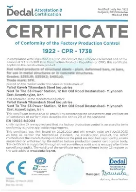 “Kave Tikme-Daş Çelik Sanayi”, ürünlerinde kalite yönetim sistemleri oluşturma alanında çelik ürünlerinin üretiminde tüm temel ilkelere uyarak, ISO9001:2015, ISO14001:2015 ve ISO45001:2018 uluslararası standartlarını ve nervürlü inşaat demiri üretimi için 3132 İran ulusal standardını ve çelik kütük üretimi için 20300 teşvik standardını karşılayabilmiştir. Ayrıca, bu şirket Avrupa'ya çelik inşaat demiri ihracatı ile ilgili EN 10025 - EN 10204 - EN 10080 - BS 4449 sertifikalarını almıştır.